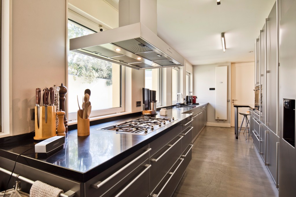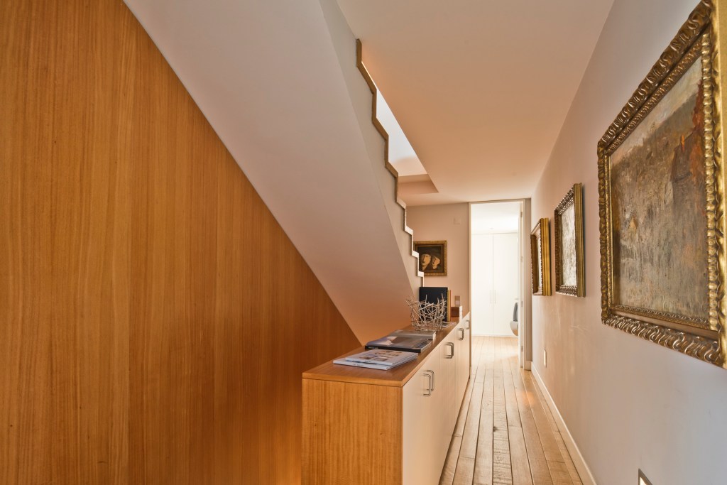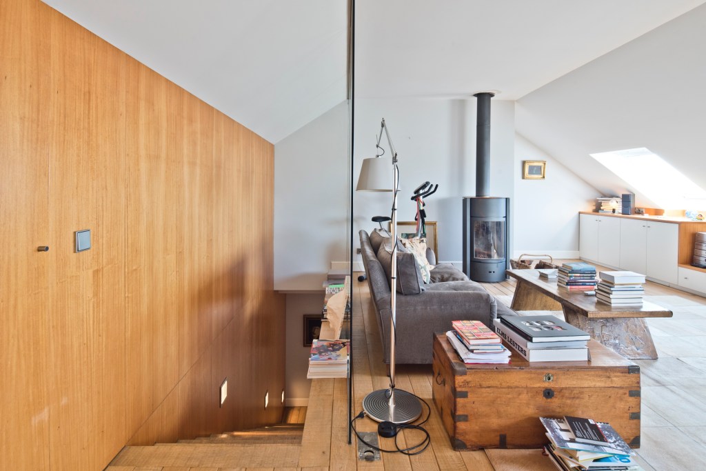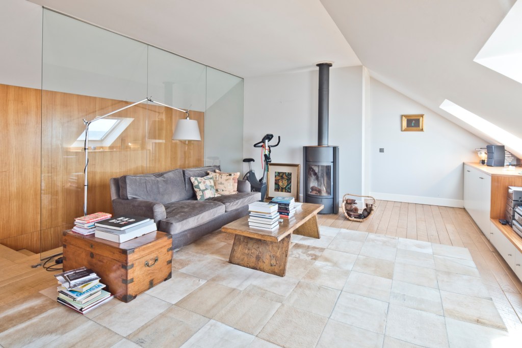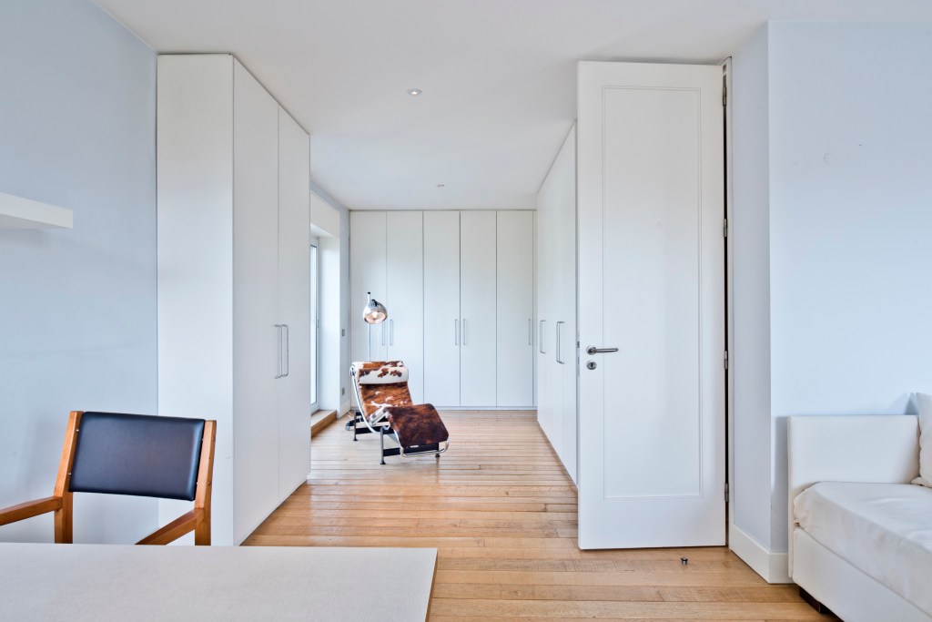 The apartment is regally voluminous, flooded with 360 degrees of light from windows on all sides of the building, has high ceilings, wide floor boards, a quaint South Westerly facing terrace, and a chef’s designed kitchen custom fit by Plain English with a La Cornue range.