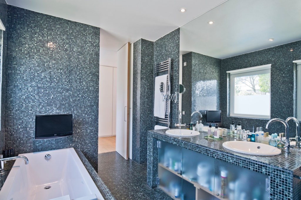 Outside of this modern and elegant architecture is a rare outside space. Lots of greenery, a private pool, tennis and paddle courts.